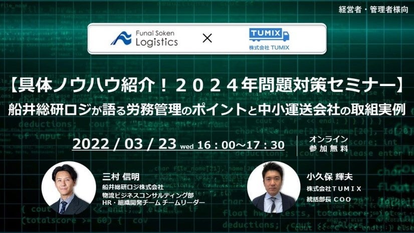 2022年3月23日(水)16:00~17:30、株式会社TUMIXが主催するセミナー「具体ノウハウ紹介!2024年問題対策セミナー」にて、船井総研ロジ株式会社(東京本社:東京都千代田区、代表:菅重宏、以下「船井総研ロジ」)の経営コンサルタントが「2024年4月に向けた物流会社の人事戦略ロードマップ」をテーマに講演します。
