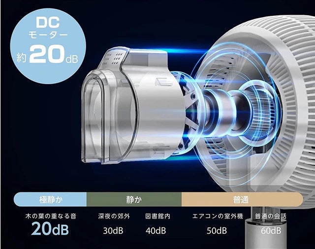 ACモーターに比べ、「風量調節」「静音性」「省エネ性」において高性能のDCモーターを搭載、圧倒的なスペックを誇ります。