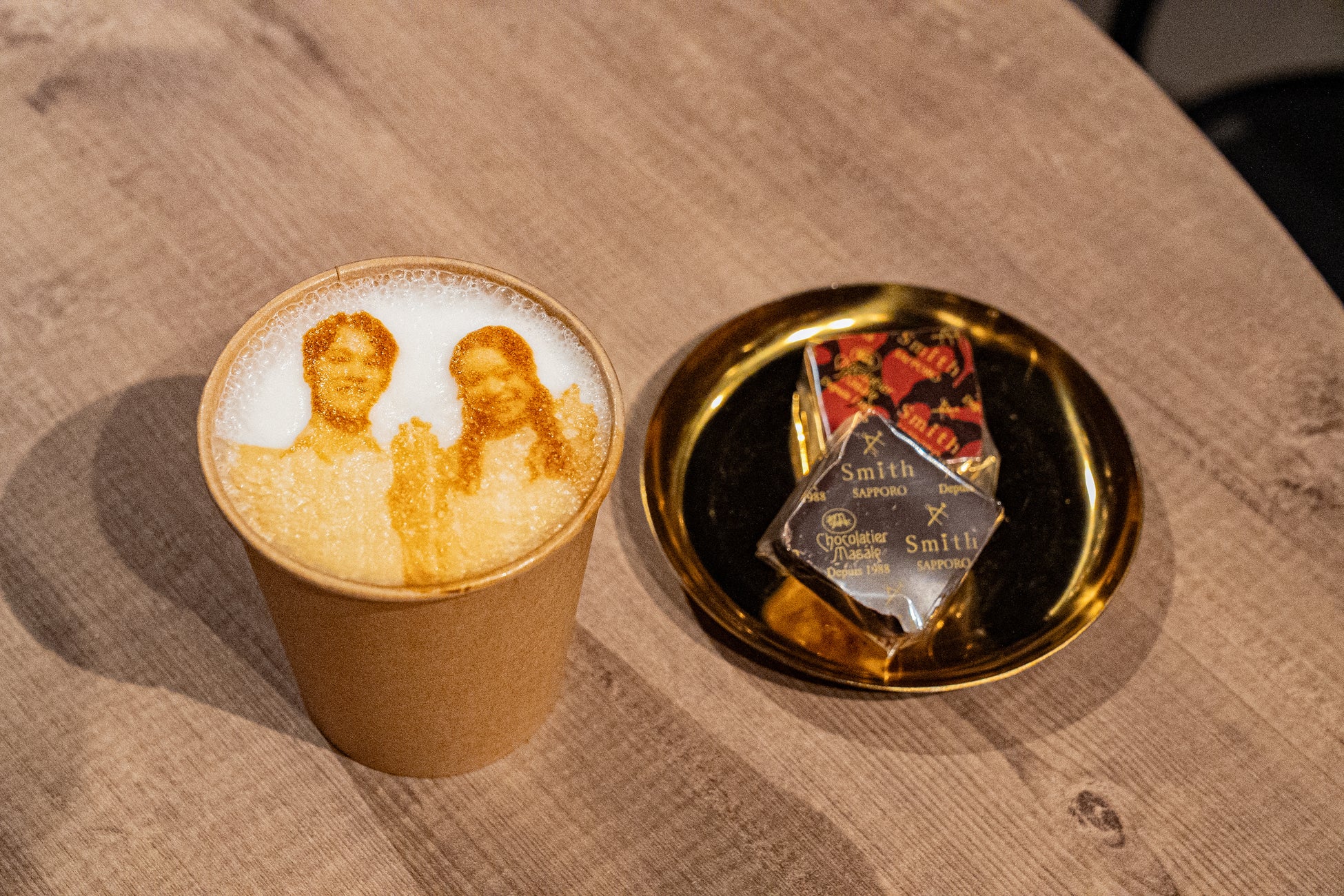世界に一つだけの「ラテプリント」: カフェラテをご希望の方には、制作中のお二人の写真をその場で転写する「ラテプリント」を提供。飲むのが惜しくなるようなサプライズ演出が好評です。