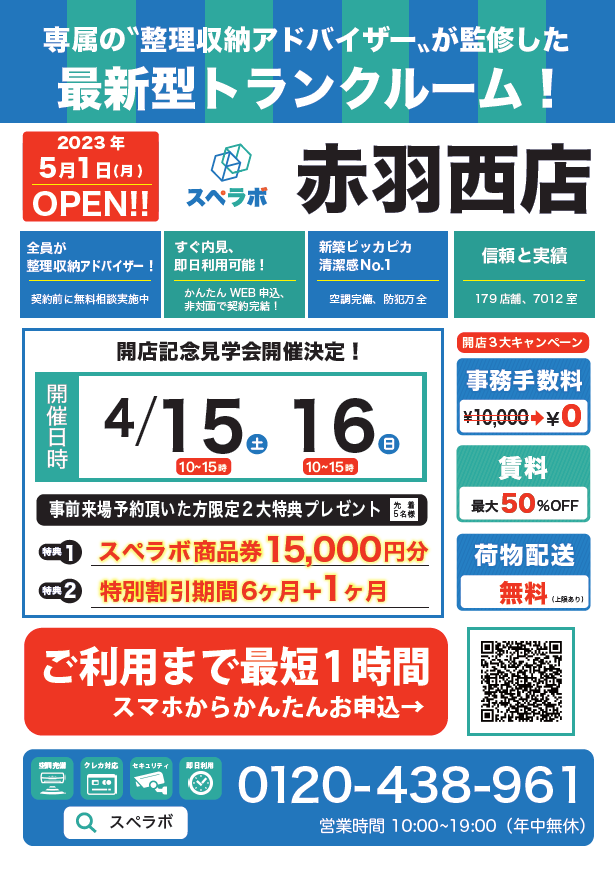 オープンに合わせ4月15日(土)・16日(日)に見学会を実施しますので、ぜひ【スペラボ・赤羽西店】にお越しくださいませ。