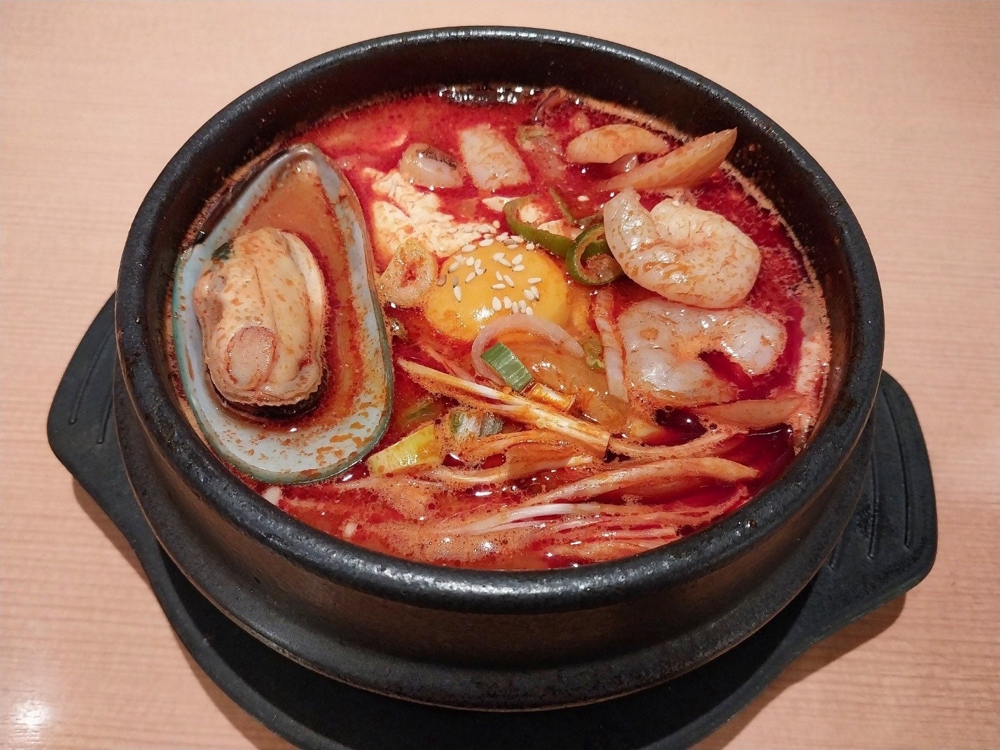 本場の味にこだわった韓国料理店の逸品。えび、あさり、ムール貝、いかが入った熱々のスンドゥブです。