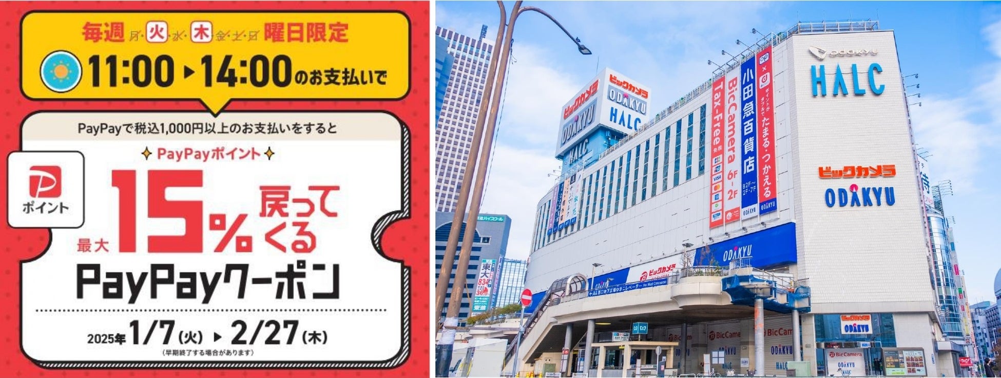 株式会社小田急SCディベロップメント(本社:東京都新宿区 取締役社長:細谷 和一郎)が運営する新宿駅西口直結の商業施設「新宿西口ハルク」は、2025年1月7日(火)~2月27日(木)の期間中、火曜日と木曜日限定で11:00~14:00の間に館内の飲食店舗(叙々苑、天兼、時屋、喫茶ピース、小田急百貨店内カフェ店舗を除く)で1,000円(税込)以上のご注文をいただき、PayPayでお支払いいただいた方に、最大15%分のPayPayポイントが戻ってくるクーポンを発行するPayPayキャンペーンを実施します。