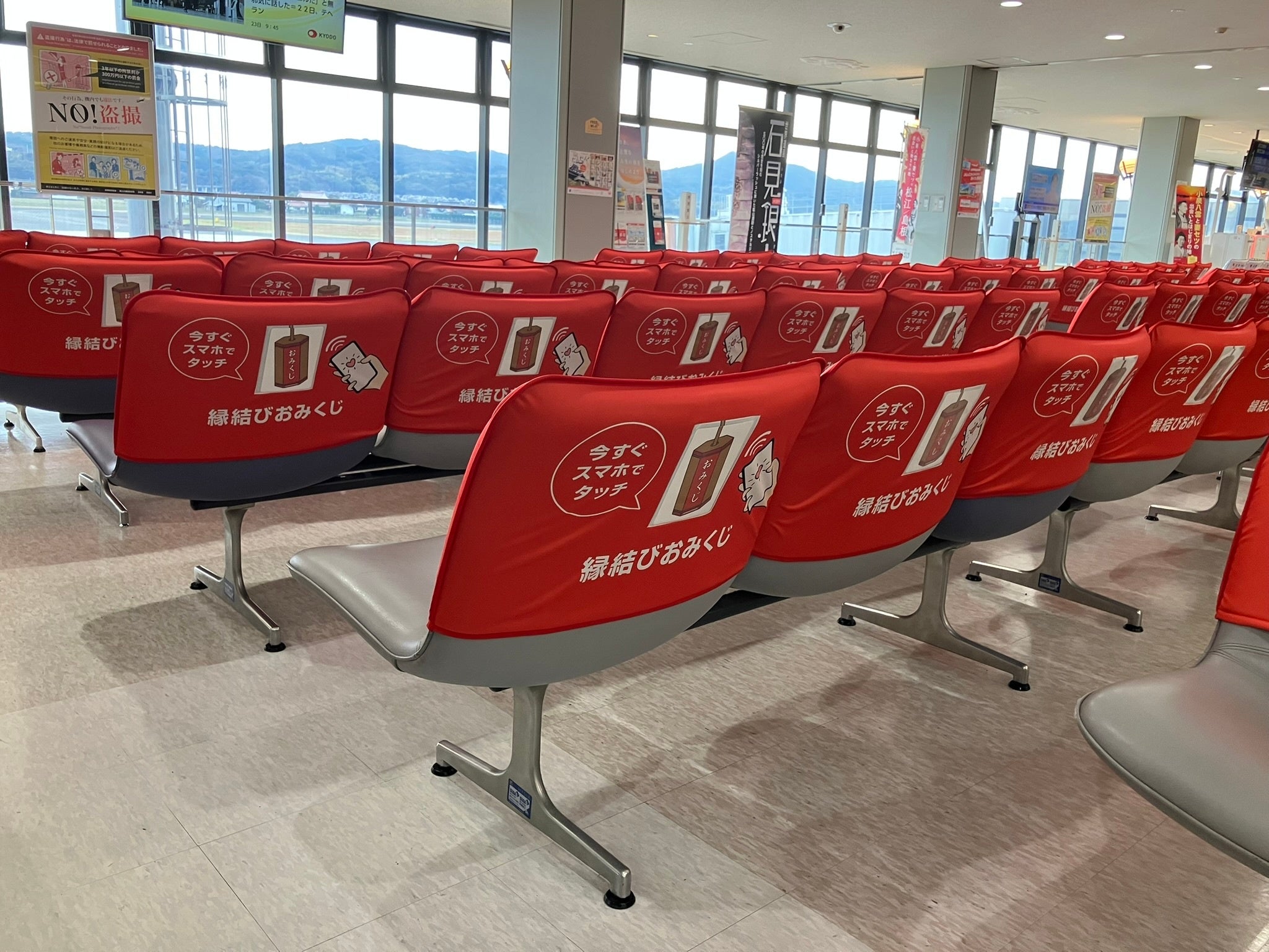 出雲空港の出発待合室の椅子も、縁起の良いキーカラー・朱色で統一。
