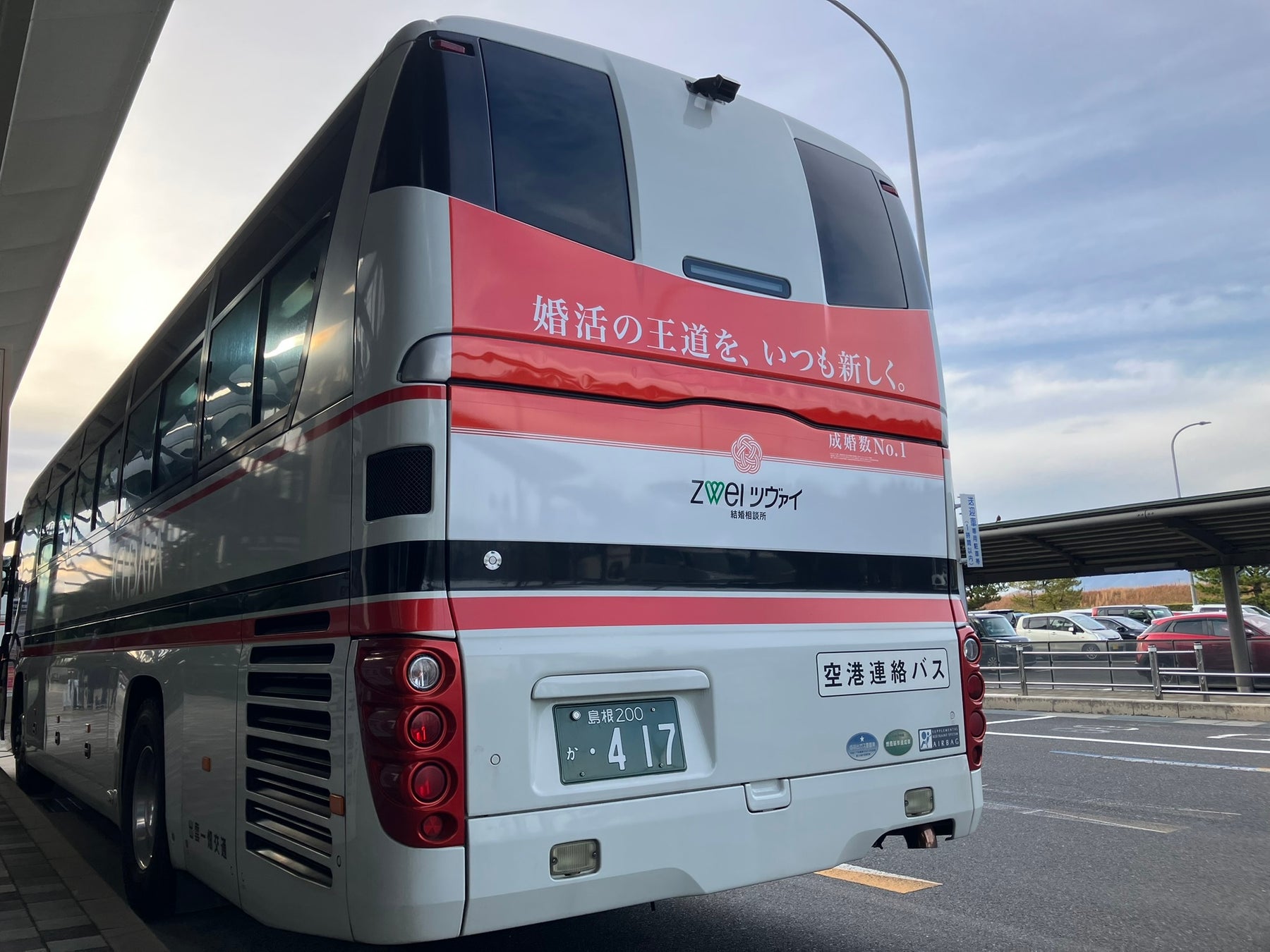 空港を利用される方に「“良いご縁”が訪れるように」という願いを込めて名付けられた出雲縁結び空港。そこから出雲大社へと向かう連絡バスの背面には、ZWEIが婚活に励む皆さまへ一番伝えたいメッセージを掲げています。