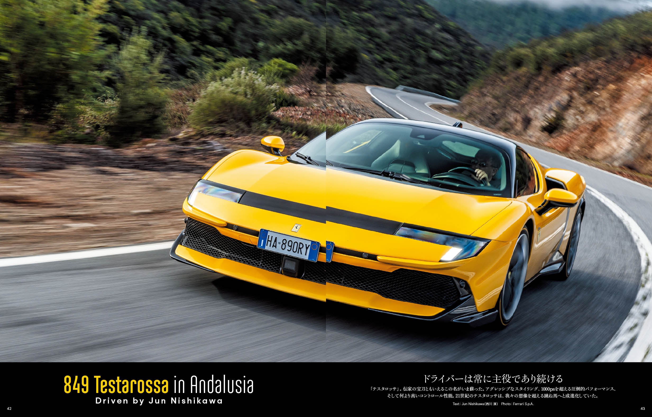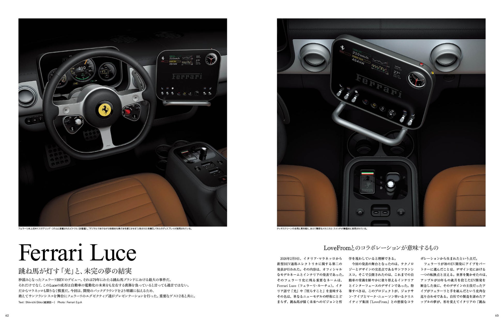 151号となる2026年春号では表紙と特集に849テスタロッサの試乗記事を収録。スペインの一般公道とサーキットでジャーナリストの西川淳氏がその走りをリポートしています。またデビューしたばかりのアマルフィ・スパイダーをグラビアで紹介。またフェラーリのEVとして注目されるLUCEの室内ディテールの様子、デザイナチームを収録しています。