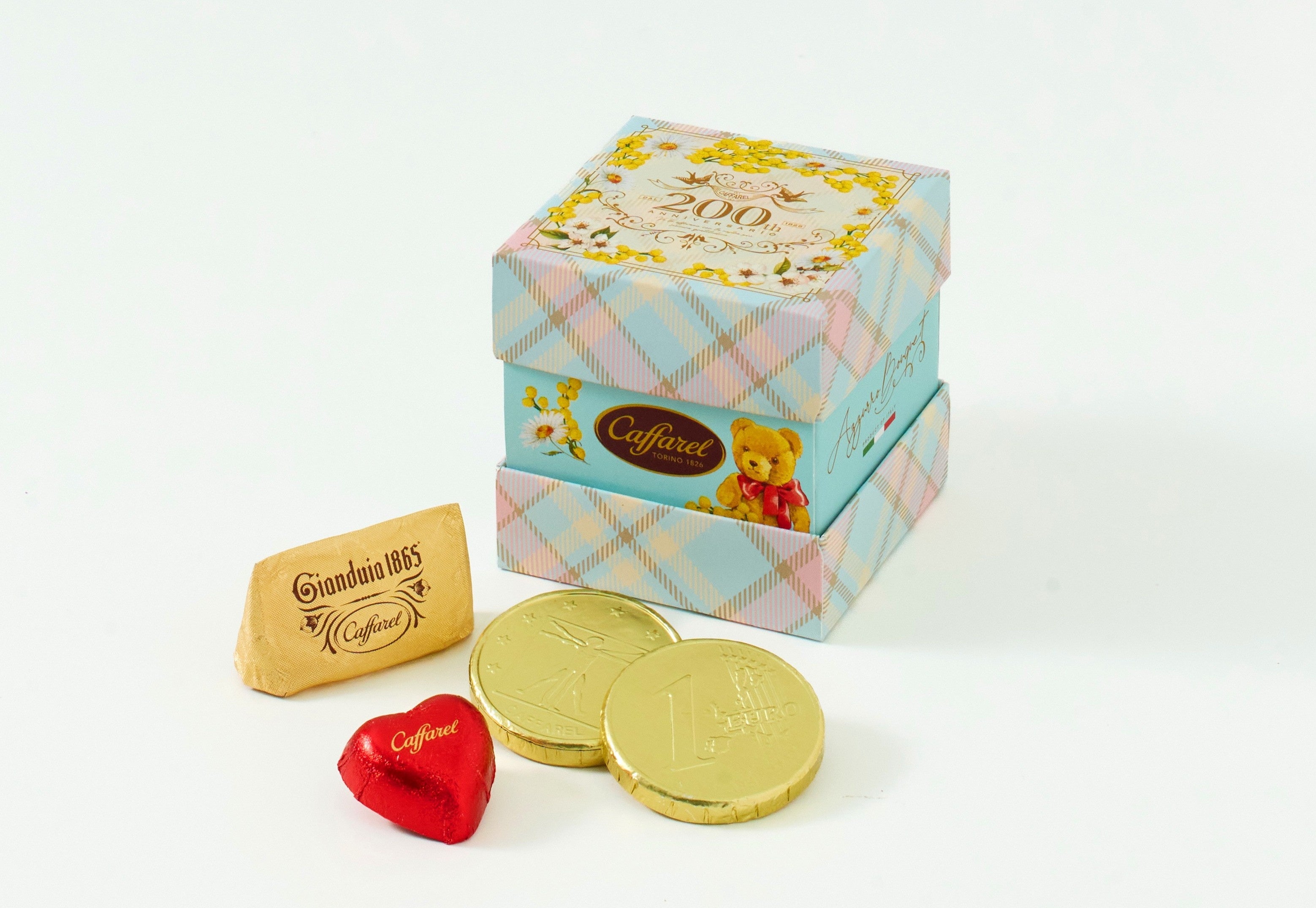 詳細:箱のトップには200周年のロゴデザインとミモザなどの春の花が咲き乱れ、側面にはテディベアがデザインされています。手のひらサイズの可愛らしいパッケージの中にはジャンドゥーヤなどカファレル定番のチョコレートを4粒アソート。