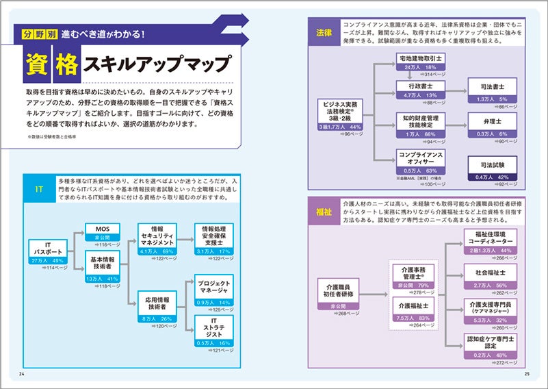 本書は1000資格の最新データを収録し、資格の選びやすさにこだわりました。初めて資格をとる人にもわかりやすい、資格スキルアップマップなど、受けたい資格が見つけられる特集も充実しています。