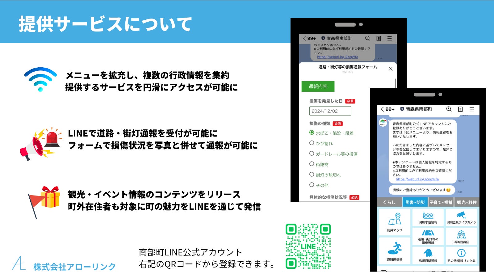 この度、株式会社アローリンク(本社:兵庫県神戸市中央区雲井通4-2-2 マークラー神戸ビル4階、代表取締役:蓬莱和真)は、青森県南部町(町長:工藤祐直)が「持ち運べる役所」としてLinyを活用し、青森県南部町LINE公式アカウントを開設したことをお知らせします。
