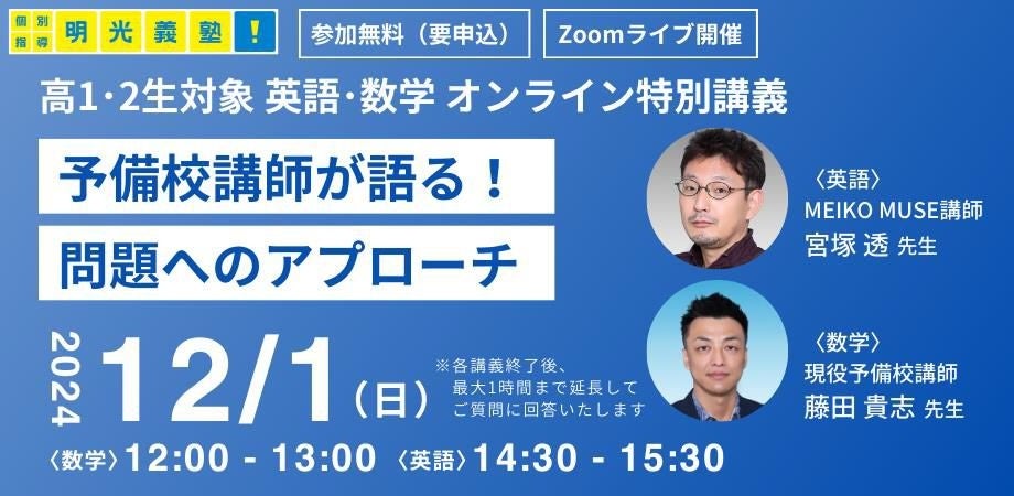 本講義では、高1・高2生を対象に、明光義塾の映像授業「MEIKO MUSE」などで大人気の英語講師・宮塚 透先生と現役予備校講師・藤田 貴志先生をお招きし、問題を解く上で基本となるポイントや、高校での勉強法について講義いただきます。ライブ配信のため、当日チャットでの質問も可能。直接先生方にお答えいただけるチャンスです。参加費は無料。明光義塾にお通いでない方もご参加いただけます。明光義塾は本セミナーを通じて、子どもたちが自信を持って大学受験に臨み、理想の未来を実現できるようサポートいたします。