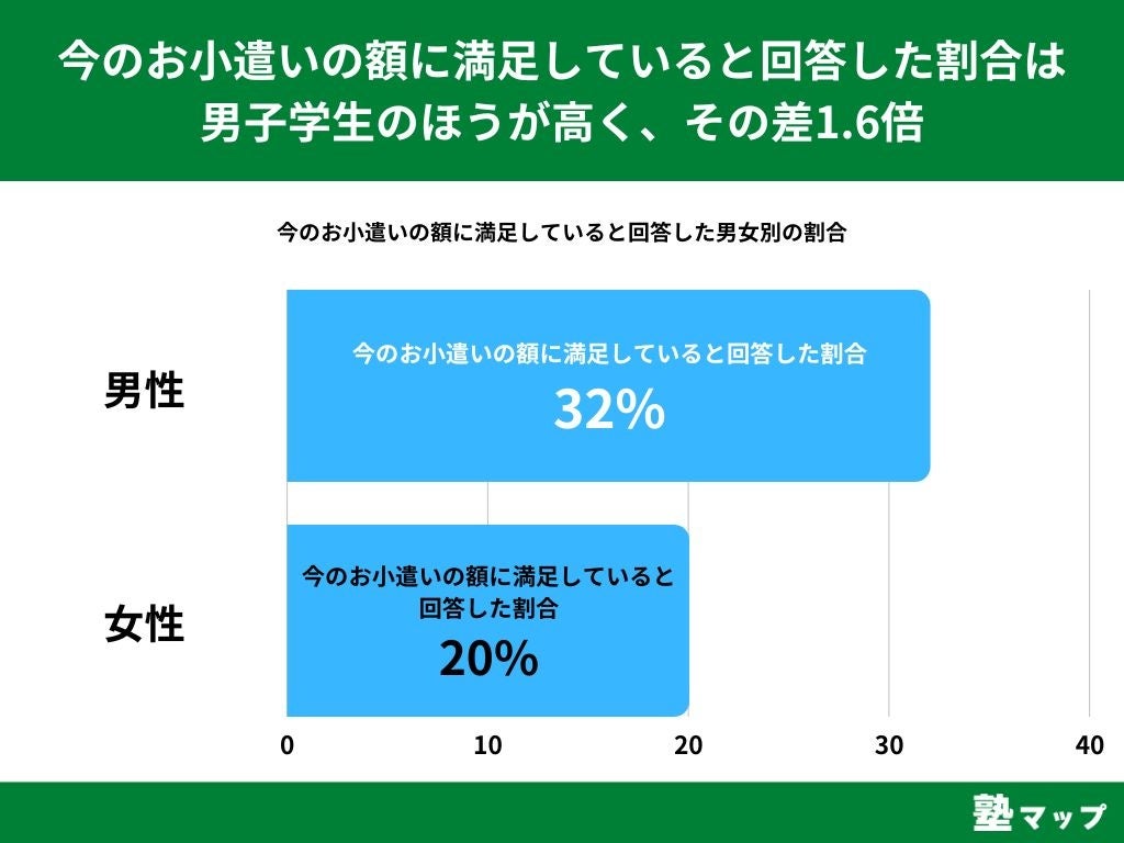 今のお小遣いの額に満足していると回答した割合を男女別でみてみますと、男性が32%、女性が20%という結果になりました。