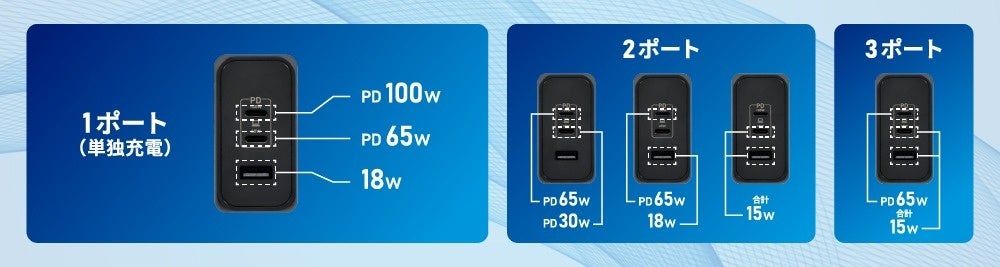 2基のUSB Type-Cポートと1基のUSB Type-Aポートを併用することで、接続機器を3台同時に充電できます。