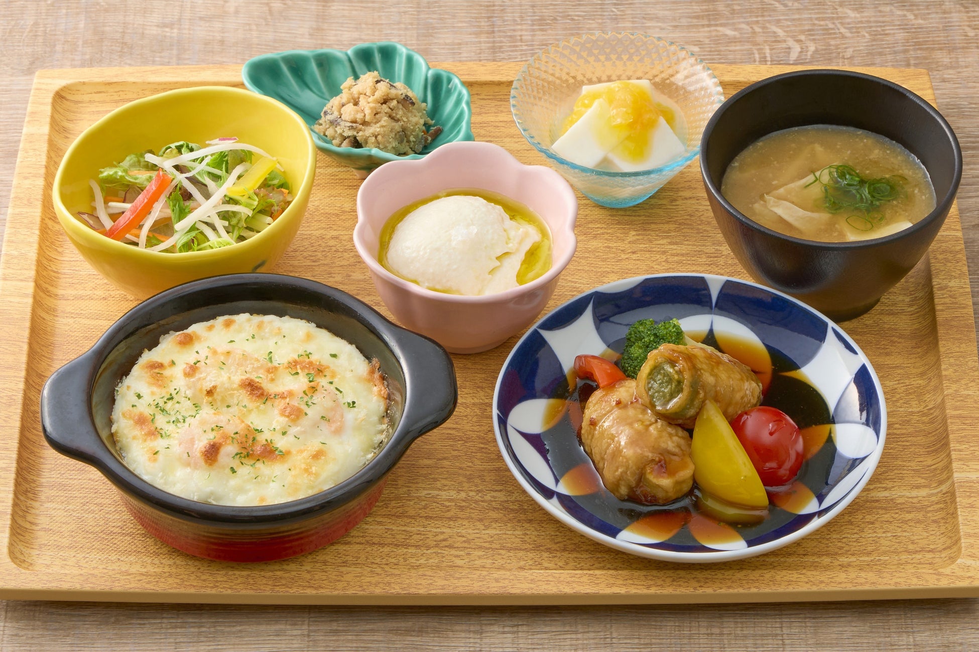 たぐり湯葉のお造り、カリカリ梅と大葉の和風ドリア、海老の豆乳マヨネーズ和えなど、和洋中のいいとこ取りをした欲張りな定食です 。