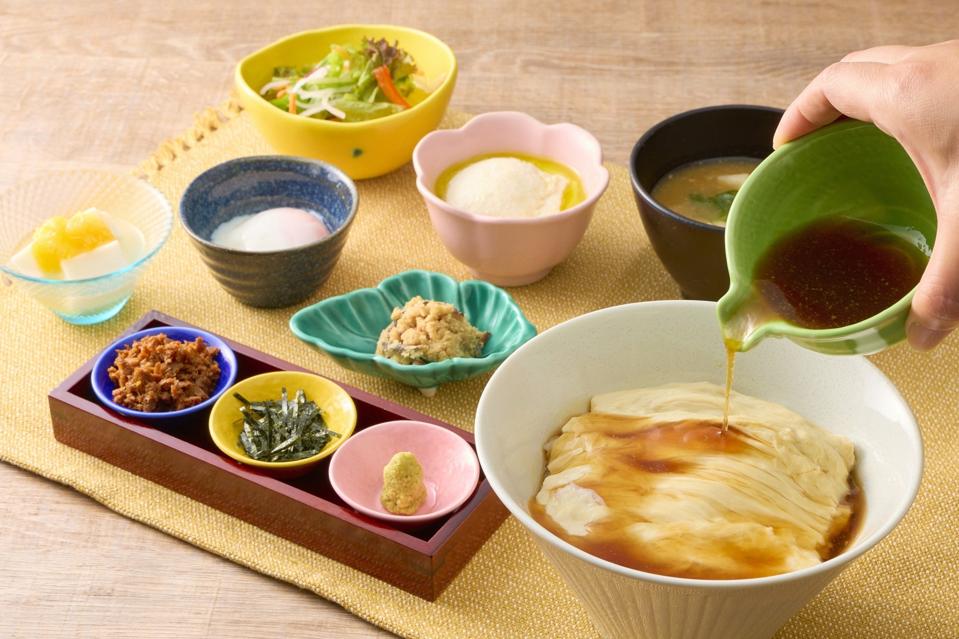 イソフラボンが1.5倍含まれる「ゆきぴりか大豆」の豆乳を使用し、出来立ての「ふく福豆冨」が味わえる定食です。卓上で火にかけるため、出来上がるまでのワクワク感とともに、出来立てならではの「大豆の甘み」「香り」「ふわとろ食感」を存分にお楽しみいただけます。