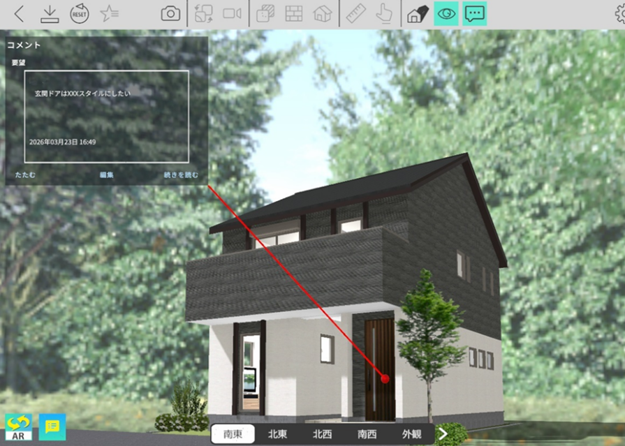 3D空間上にコメントを直接入力できる「3Dメモ」機能を強化しました。パース画面上の任意の位置にコメントを付与することで、図面だけでは伝わりにくい設計意図や修正指示を、視覚的かつ直感的に共有できます。