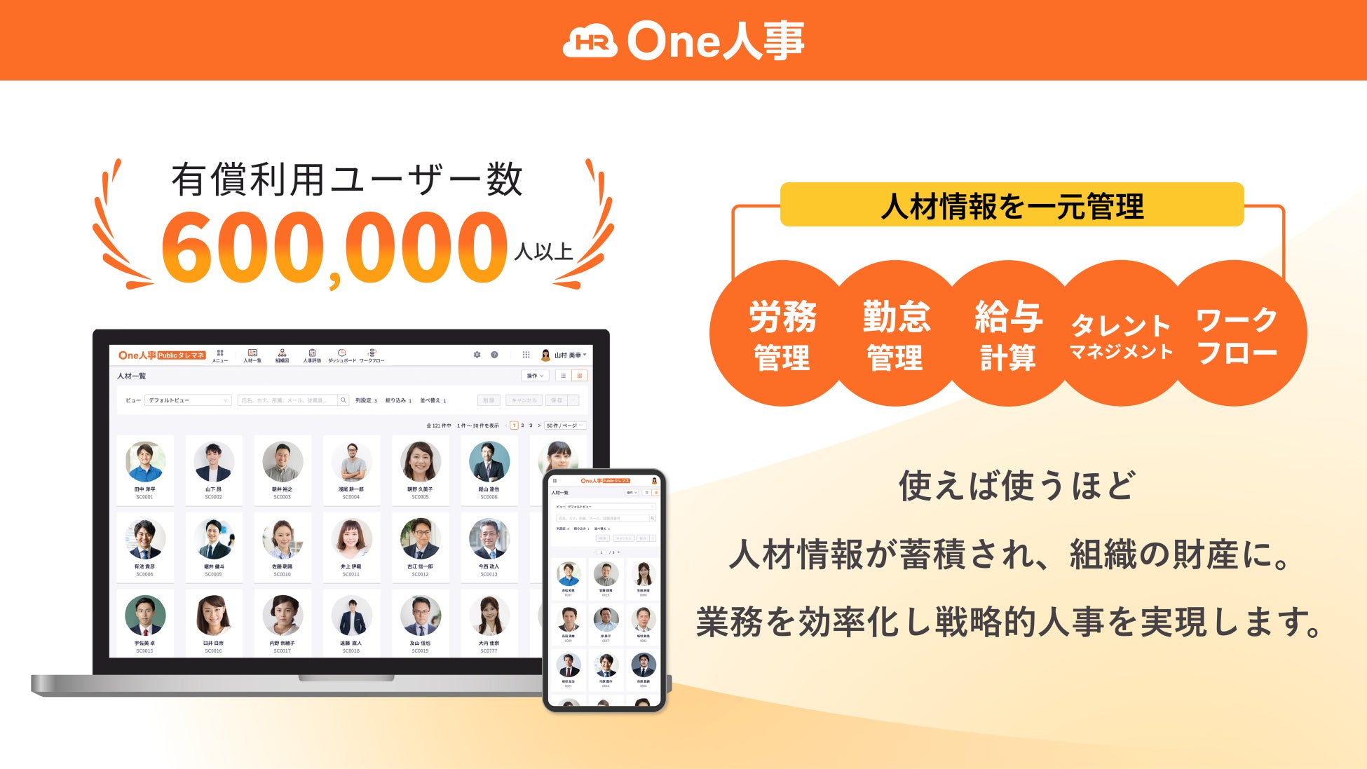 有償利用ユーザー数60万人を突破!勤怠管理、労務管理、給与計算、タレントマネジメントをワンストップで業務効率化する人事労務システム「One人事」。社員の成長と業務の効率化を全面的に支えます。