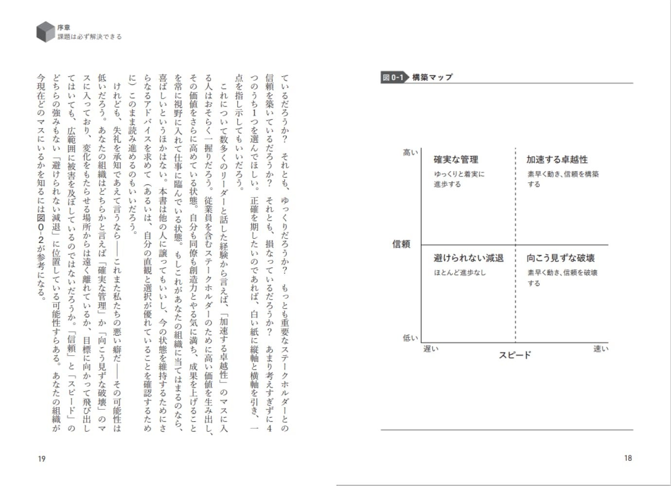 本書は、組織の信頼とスピードを縦軸と横軸にとり、その両者を高い状態に維持するためにリーダーが行うべき行動を以下の5つのステップにまとめています。