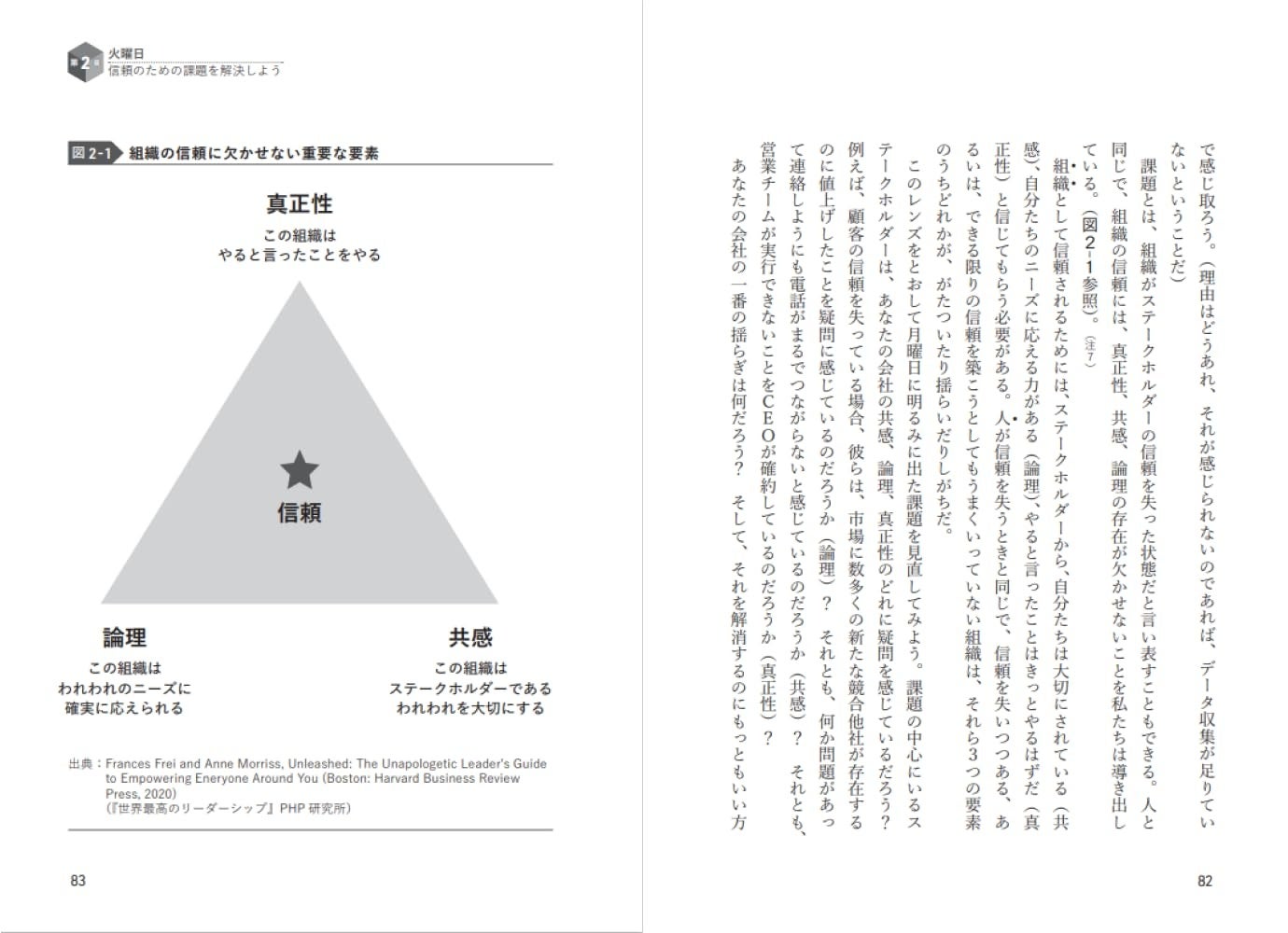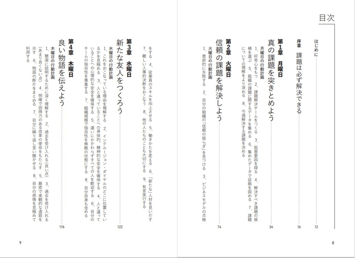 本書は、ウーバー、ライオットゲームズなどを次々に再生した組織改革とリーダーシップの専門家である著者らが、周りの人々をエンパワメントし、信頼を勝ちとることで、組織が抱える困難な課題を最速で解決する5つのステップを月曜日から金曜日までの行動計画に落とし込んだ、リーダーのための実践的なプレイブックです。