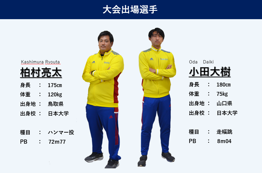 ハンマー投の柏村亮太選手、走幅跳の小田大樹選手ともに直近で出場した大会では優勝を飾る目覚ましい活躍をしています。今回大会での躍動にも期待が高まります。