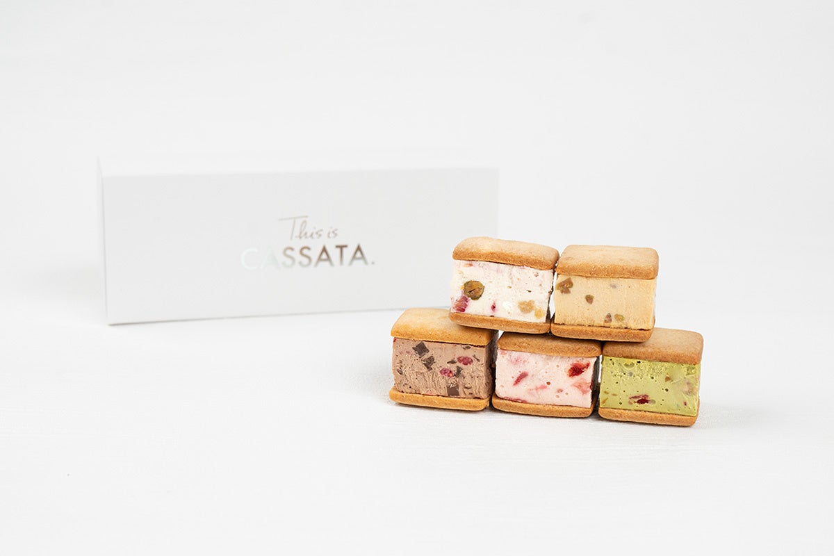 5種のフレーバーからお好きなカッサータサンドを5つ選んで、オリジナルボックスに詰めてお渡しします。