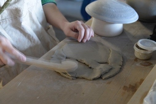 ※1 板づくり…粘土を板状に伸ばし、それを切ったり、曲げたり、貼り合わせたりして形を作る技法。今回は板状の粘土を型にあてて器の形に成形する。