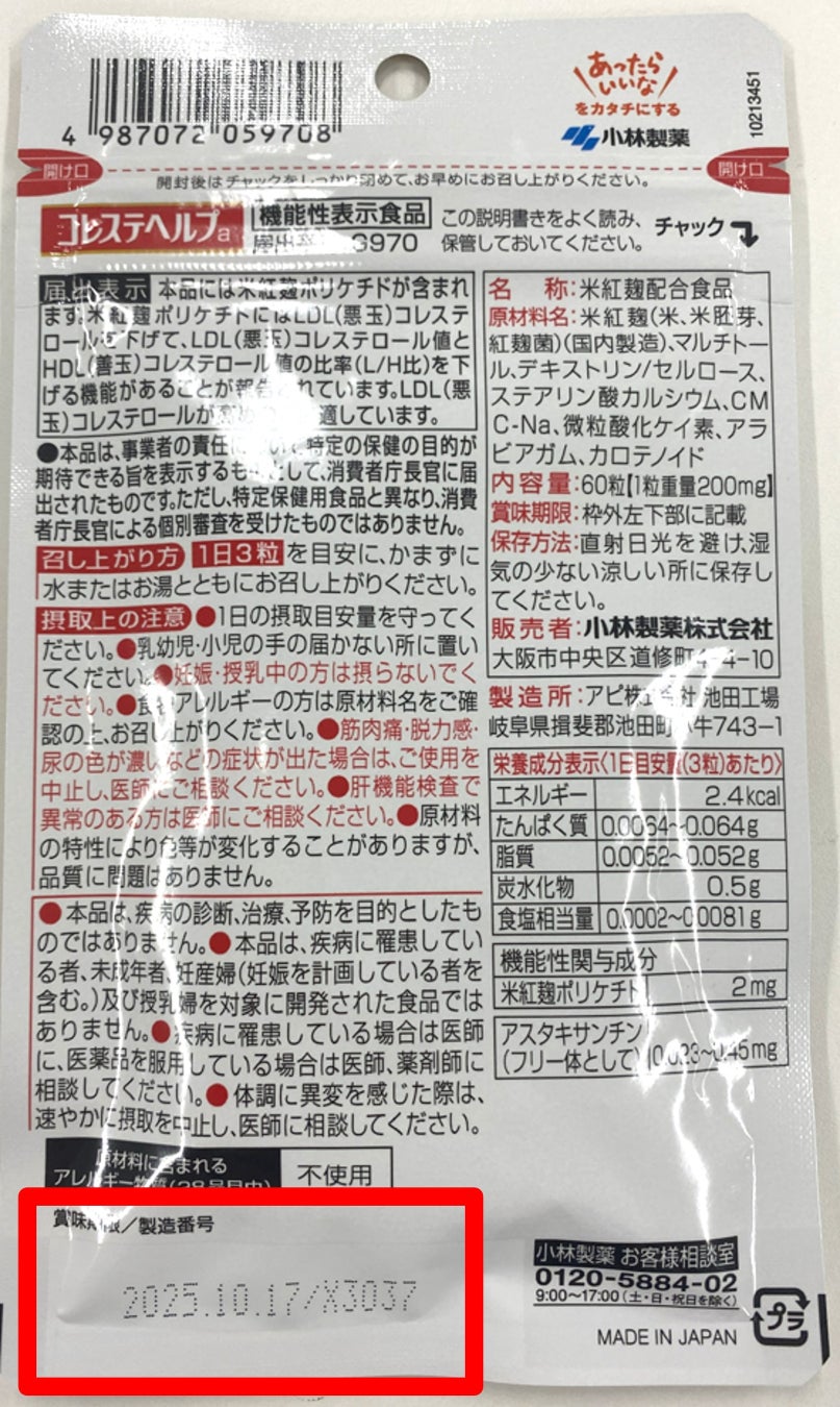 当社の想定していない成分を含む可能性がある紅麹原料を使用した紅麹コレステヘルプの製造番号は、以下のとおりです。