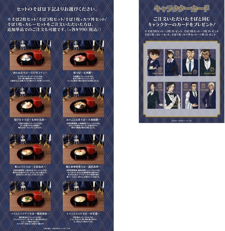 前期は、劇場版『名探偵コナン 隻眼の残像』の舞台でもある長野県の名物「信州そば」をイメージしたそばを中心に、カツ丼・カレーのセットメニュー、信州の郷土料理「おやき」をイメージし、おやき生地で焼き上げたコナン型ワッフルなど、映画で活躍の長野県警3人から着想を得たお料理をご提供いたします。そばは2枚セット、3枚セットと好きなキャラクターのそばを組み合わせてお楽しみ頂けます。 その他にも、名探偵コナンカフェの定番メニュー「江戸川コナンの蝶ネクタイ型変声機クリームソーダ」が今年はゼリーパフェにアレンジされ、SNS映えする各種ドリンクなどこだわりのメニューをご用意いたしました。