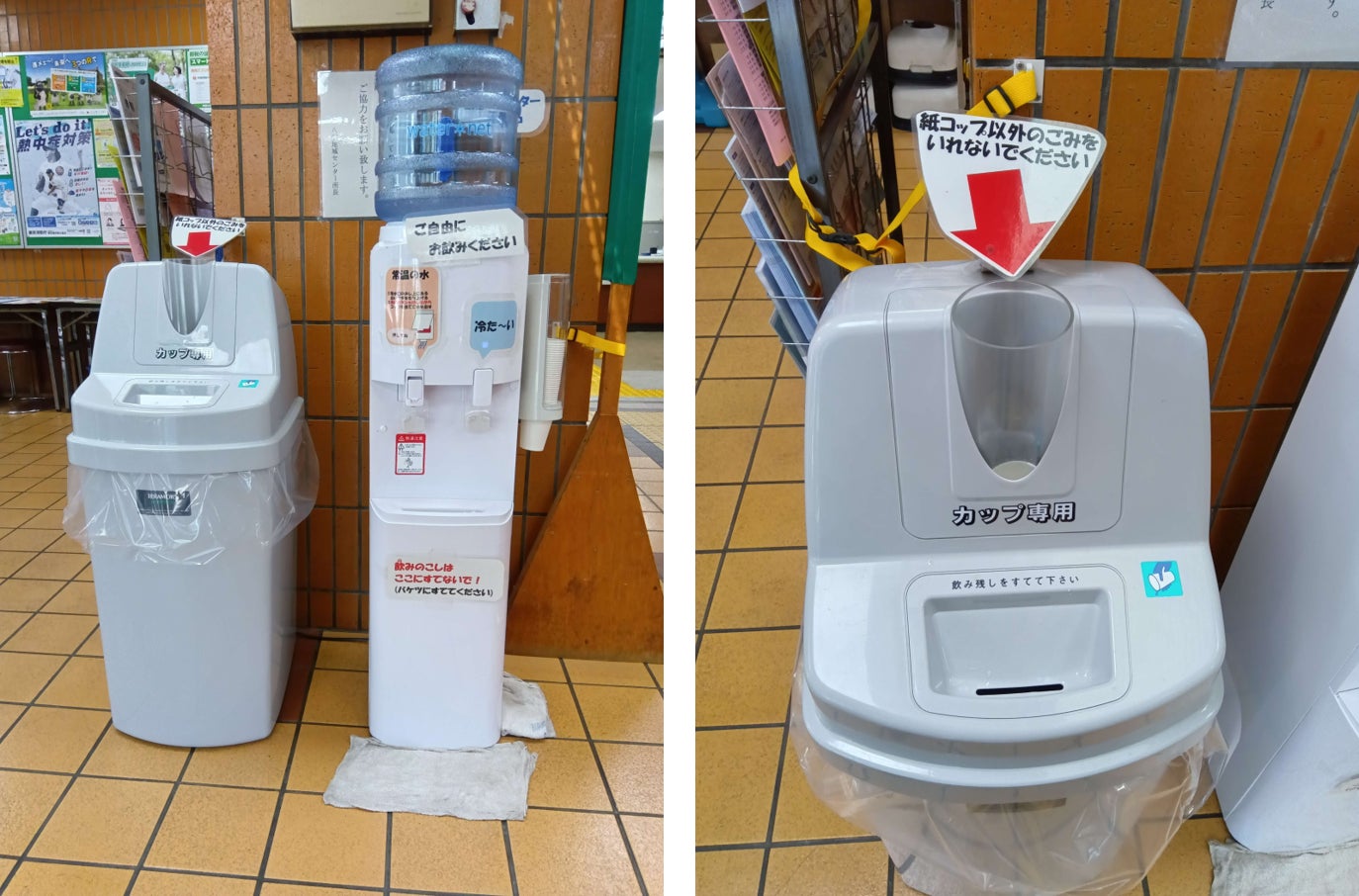 八潮地域センターに設置されたウォーターサーバーと紙コップの回収箱