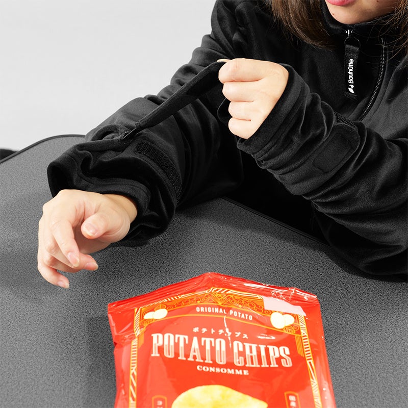 過去発売のダメ着で大変ご好評いただいた、指先の露出度合いを4段階で調節できる独自の手袋システムを継承しました。スマホ操作に用いる親指のみ露出する「スマホモード」、キーボード/マウス操作時はミトンを手の甲に固定して冷気から守る「ガントレットモード」など、使用するデバイスや室温に合わせて、最適なモードへ瞬時に切り替えることが可能です。