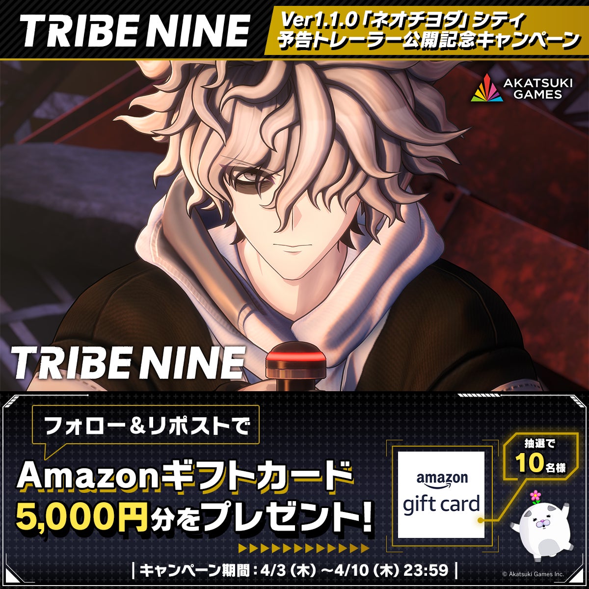 「Ver1.1.0「ネオチヨダ」シティ予告トレーラー」の公開を記念して、『トライブナイン』公式X(@tribenine_tokyo)にて、抽選で10名様にAmazonギフトカード5,000円分が当たるフォロー&リポストキャンペーンを開催中です。