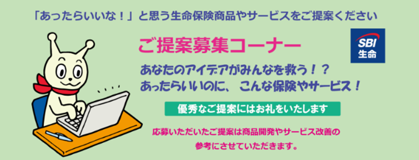 ご提案募集コーナーは、お客さまの生の声に耳を傾けることで顕在化していないニーズを捉え、商品化・サービス化につなげていくことを目的に、2019年に開設したコーナーです。詳しくは当コーナー公式ページ(https://www.sbilife.co.jp/corporate/goteianbosyu.html)をご参照ください。
