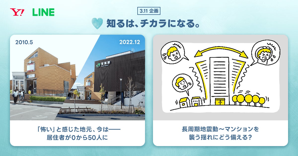 ヤフー株式会社(以下、Yahoo! JAPAN)およびLINE株式会社(以下、LINE)は、2011年に発生した東日本大震災から12年となる今年の3月11日に向けて、2社共同企画「3.11 これからも、できること。」(以下、本企画)を実施します。
