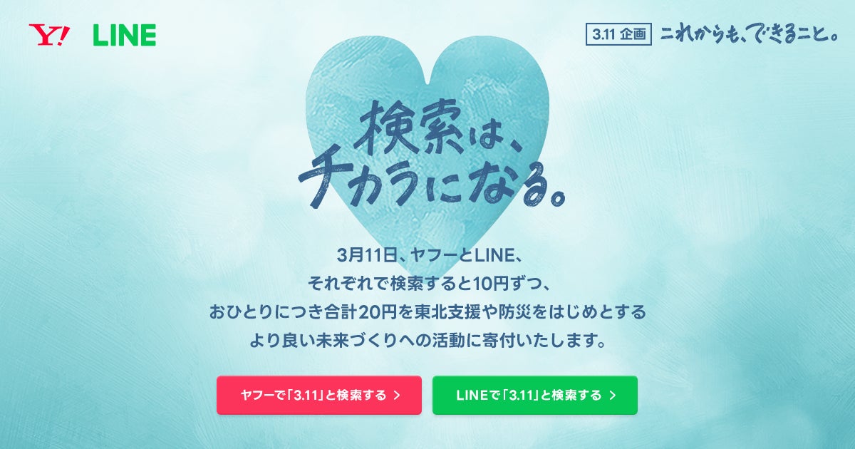 2023年3月11日に「3.11」と「Yahoo!検索」で検索すると10円、「LINE Search(「LINE」のニュースタブ上部の検索窓)」で検索すると10円、合わせてひとりにつき20円をYahoo! JAPANとLINEから東日本大震災の被災地支援や防災をはじめとするより良い未来づくりへの活動に寄付します。
