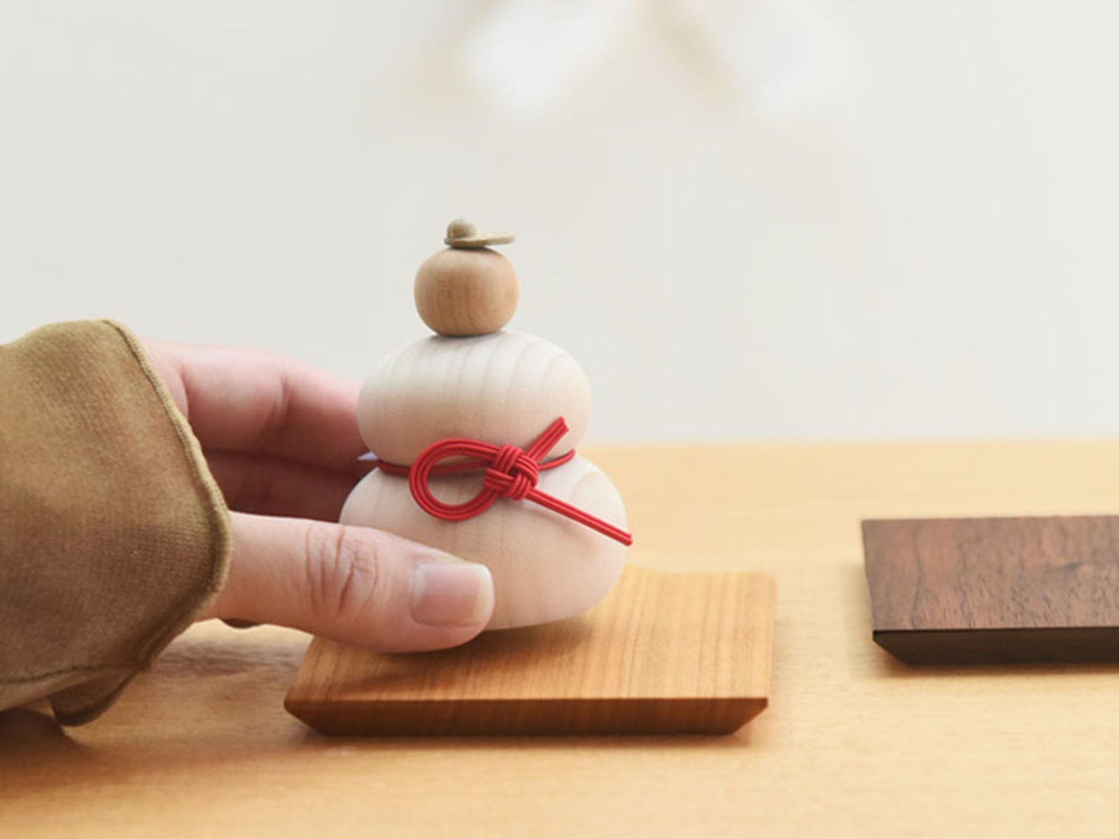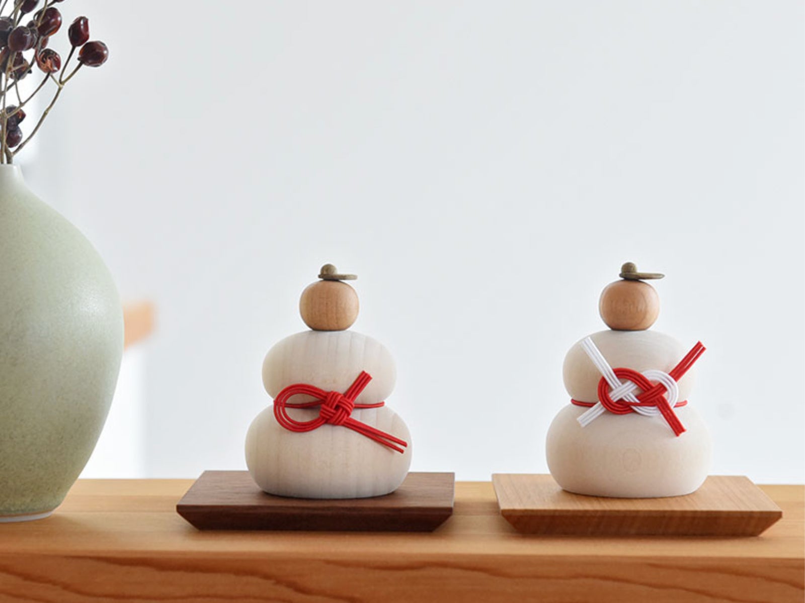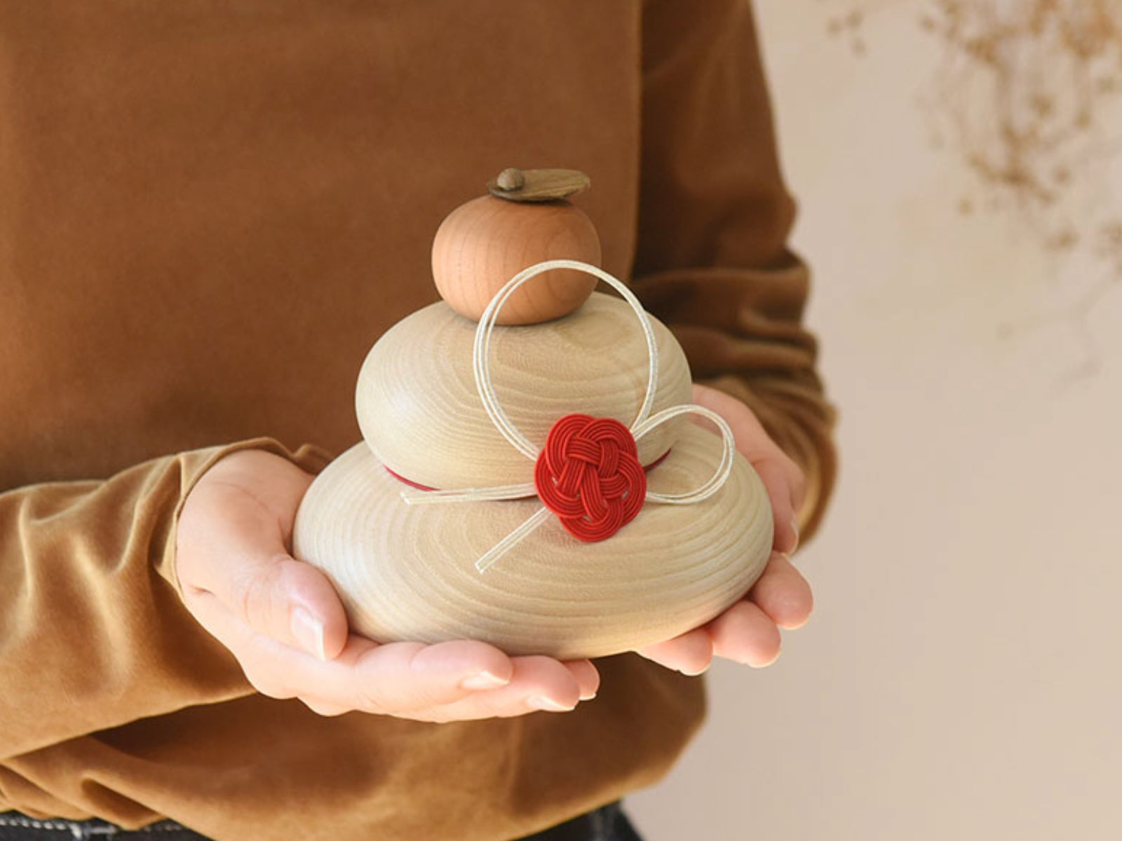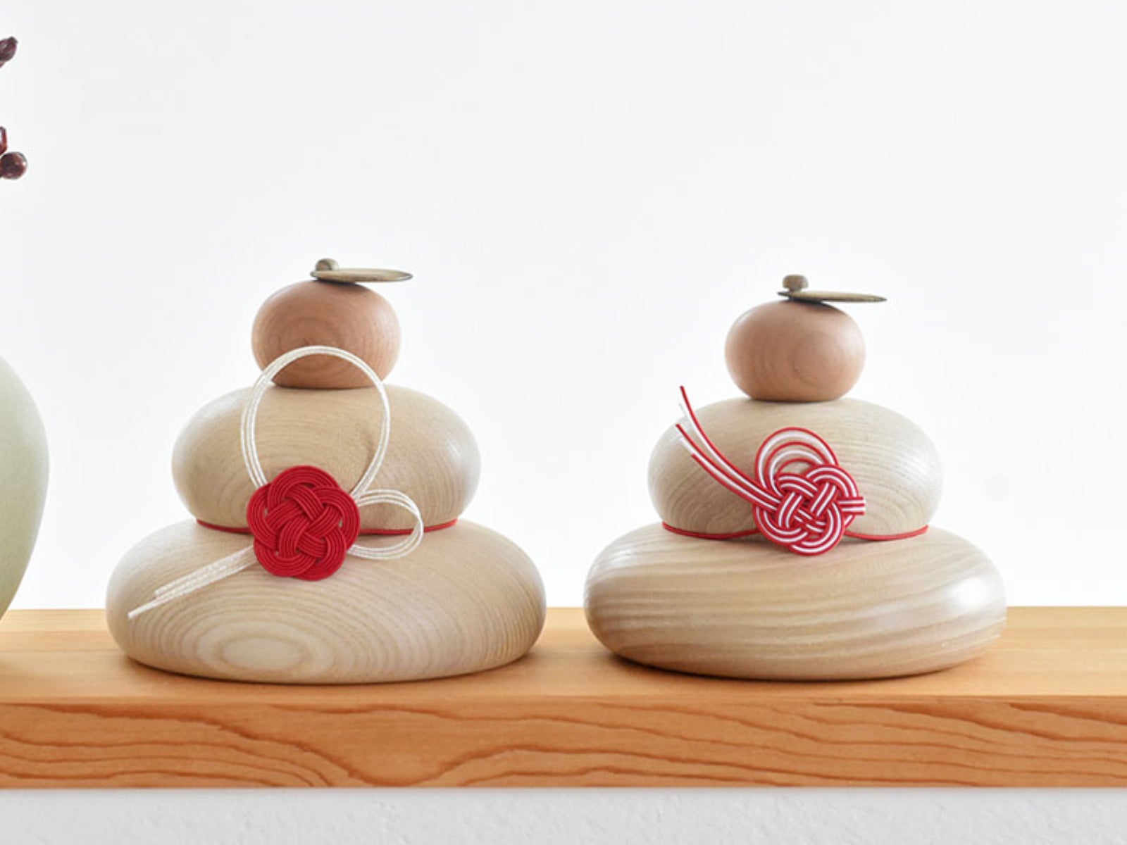 天然素材のあたたかみを楽しめる、木製の鏡餅。木工メーカー「ドリーミィパーソン」が手掛けた鏡餅に、「hare」のオリジナル水引が合わさった、アンジェ限定のコラボ作品です。