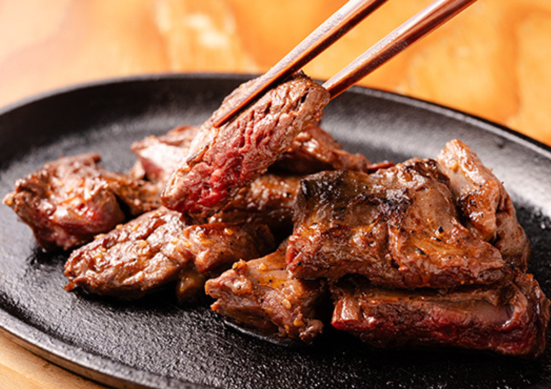 全国にあるワンダーステーキで大人気の商品となります。その名前の通り、とてもやわらかく口の中でとろける様なステーキとなります。その柔らかさの秘密は、秘伝のタレにステーキを3日間漬け込むことで実現しています。今回提供する「とろけるハラミカットステーキ」は、肉を一口サイズにカットしてからタレに漬け込む為、「より柔らかく」「より味わい深い」商品となっています。