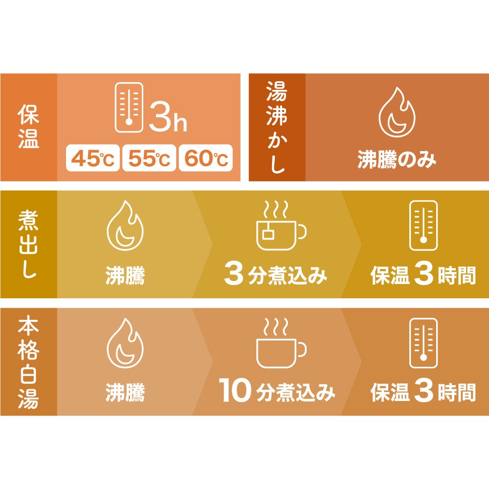 ・モード/4種類(保温/湯沸かし/煮出し/本格白湯)/保温モード:45℃・55℃・60℃(自動保温3時間)