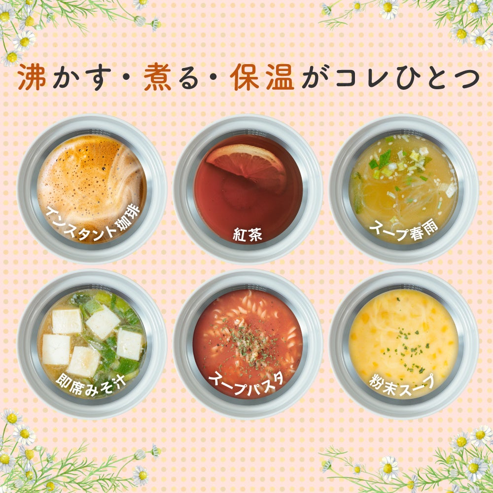 飲み物だけでなく、スープやミニラーメンなどを入れて調理し、そのまま器としても使うことも可能です。マグカップは丸ごと洗うことが可能。沸騰後でも飲み口が熱くなりにくい飲み口カバーを採用。