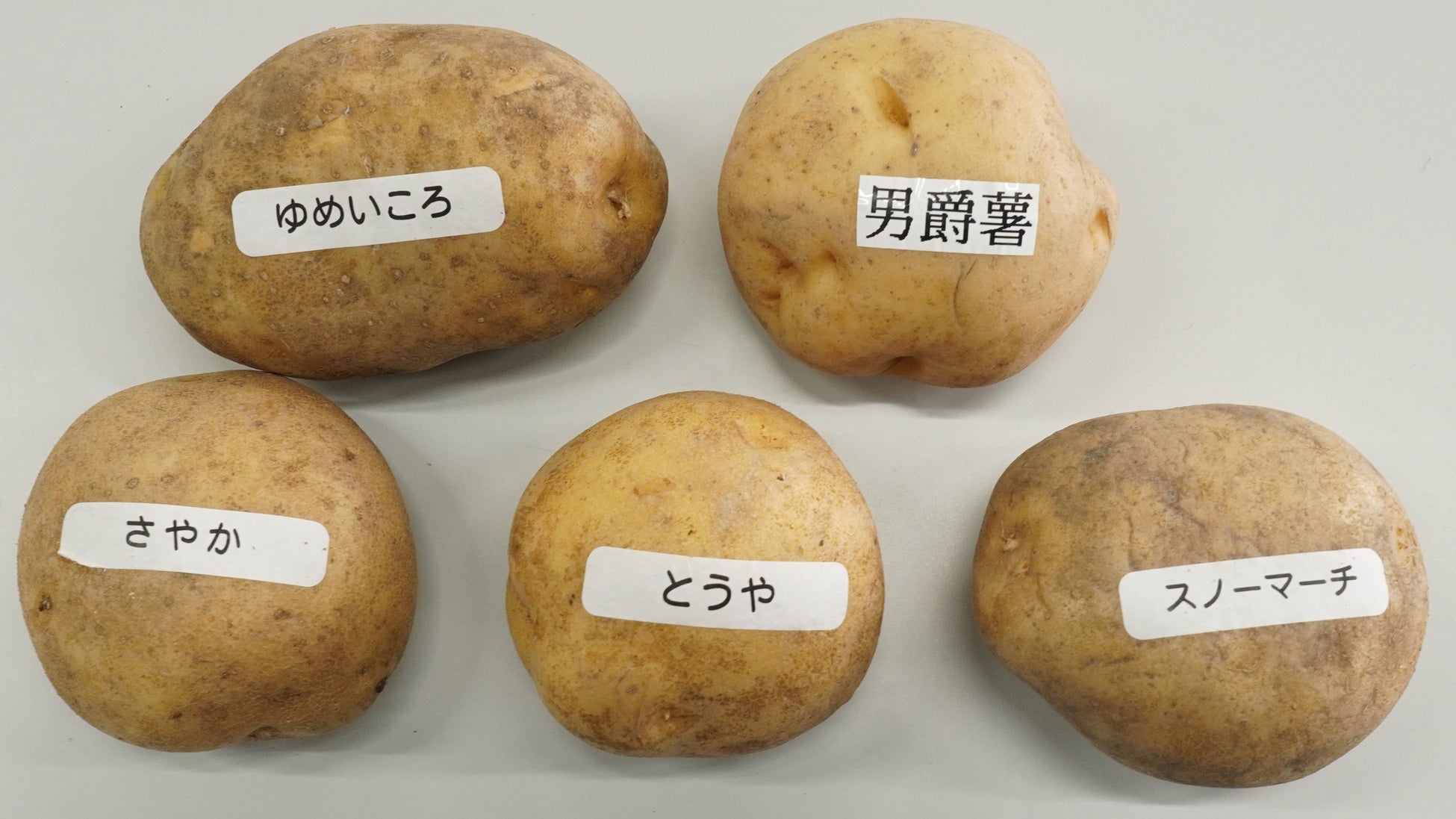 じゃがいもは収穫後の貯蔵期間中にショ糖・果糖・ブドウ糖などの糖分が増加していくことや、特に「男爵」や「さやか」では、収穫後の翌年春から初夏(6月頃)にかけて糖分が高くなる傾向が見られることを説明しました。
