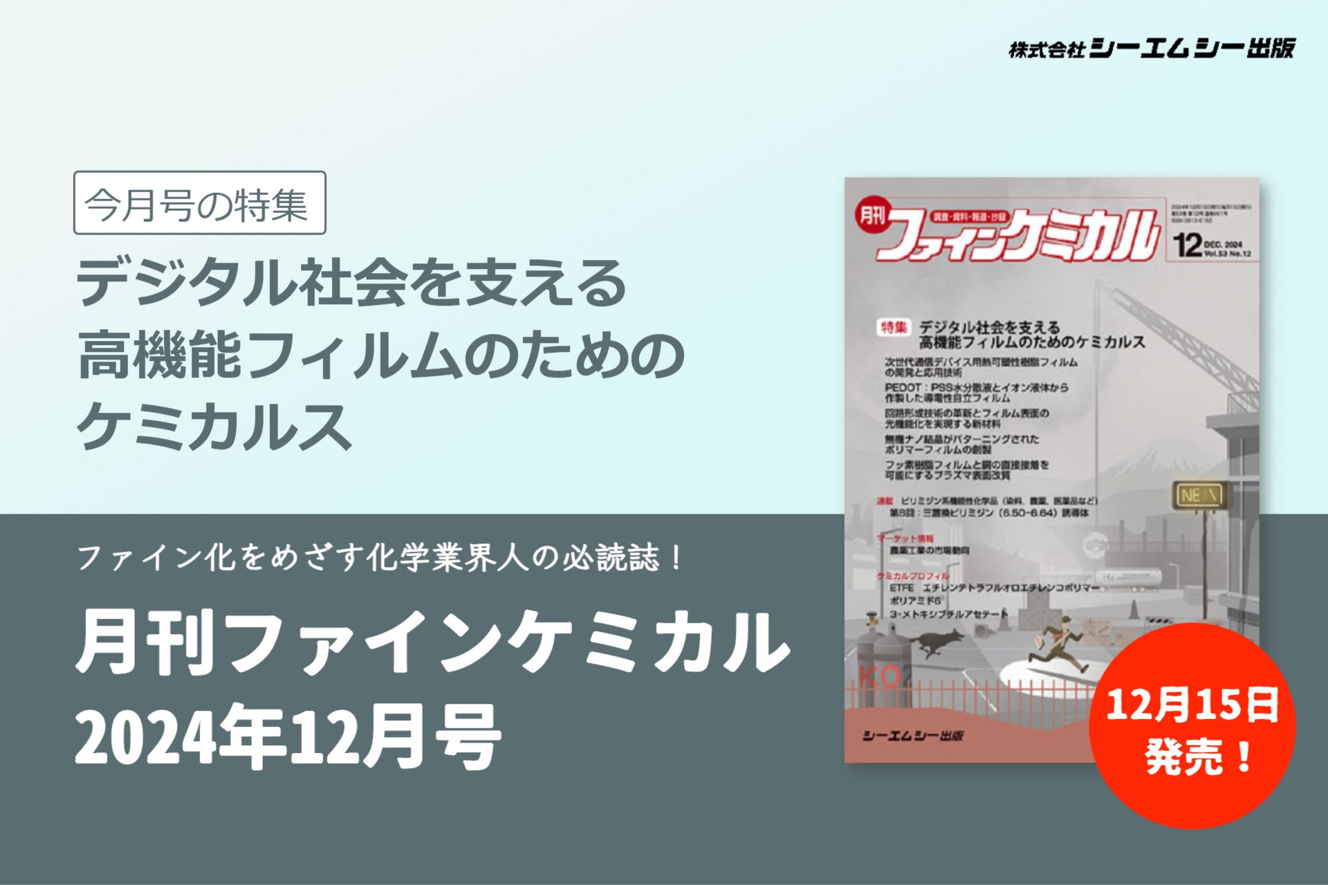 特集は「デジタル社会を支える高機能フィルムのためのケミカルス」。『月刊ファインケミカル 2024年12月号』が発売!