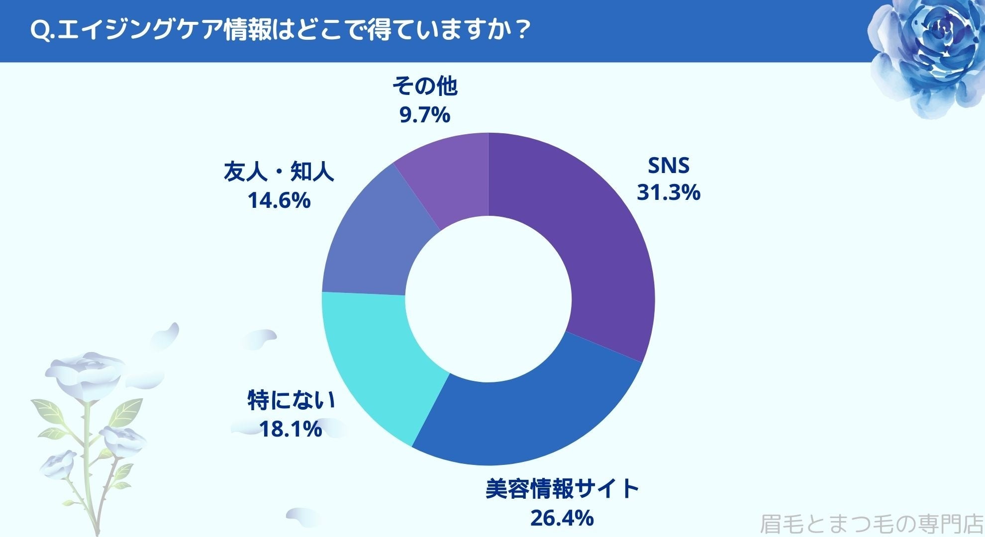 エイジングケア情報をどこで収集しているかお聞きしたところ「SNS(31.3%)」、「美容情報サイト(26.4%)」、「特にない(18.1%)」、「友人・知人(14.6%)」、「その他(9.7%)」という結果になりました。