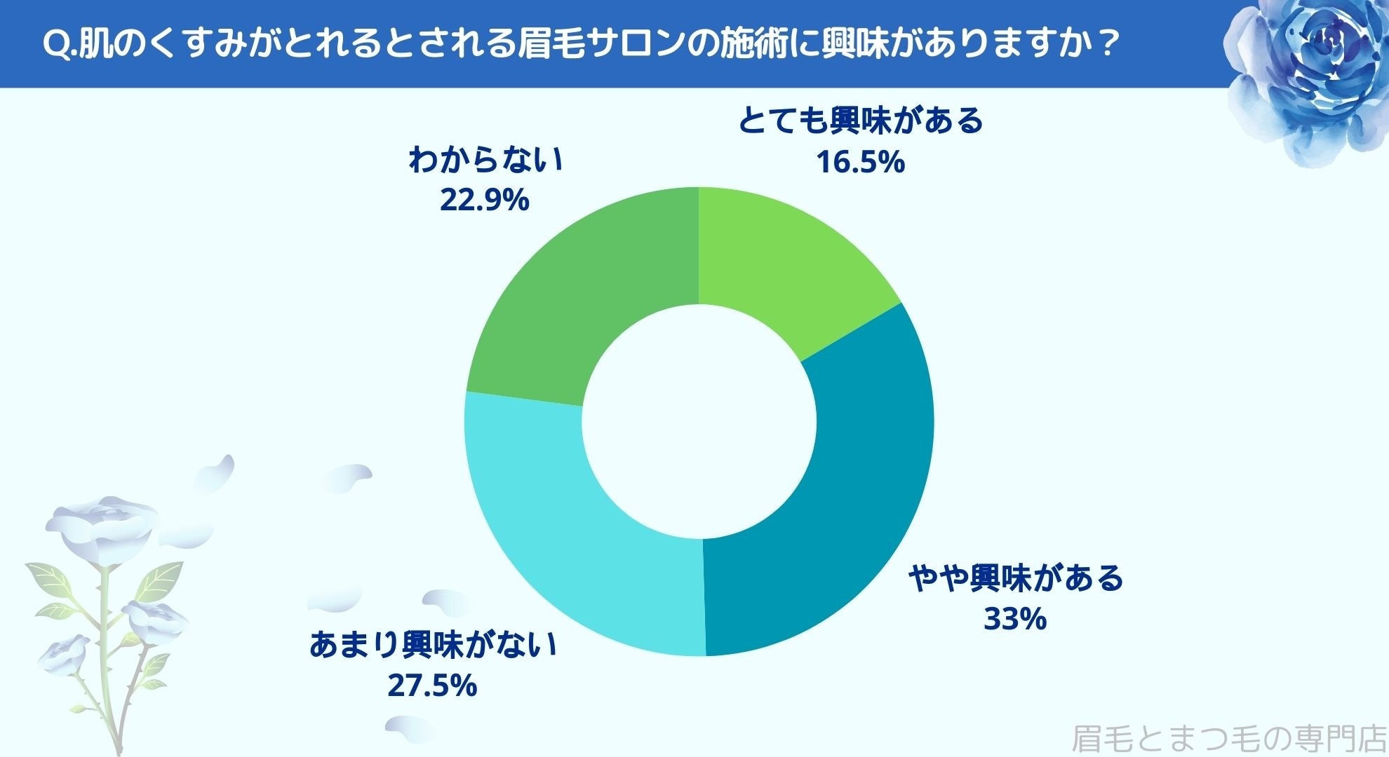 肌のくすみがとれるとされる眉毛サロンの施術に興味があるかお聞きしたところ「とても興味がある(16.5%)」、「やや興味がある(33%)」、「あまり興味がない(27.5%)」、「わからない(22.9%)」という結果になりました。