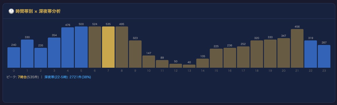 日中の相談では「仕事のストレス」「人間関係の悩み」といった具体的なテーマが多い一方、深夜帯には「生きる意味がわからない」「自分には価値があるのか」といったテーマの比率が上昇します。これはハーバード大学の「Mind After Midnight」仮説で示された深夜帯の認知変化とも整合する傾向です。