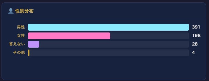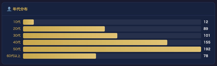 任意のプロフィール登録(年代・性別)を行った利用者の分布は、50代が最多、次いで40代、30代、20代、60代以上と続きます。10代の利用者も確認されています。性別では男性が約6割を占めます。