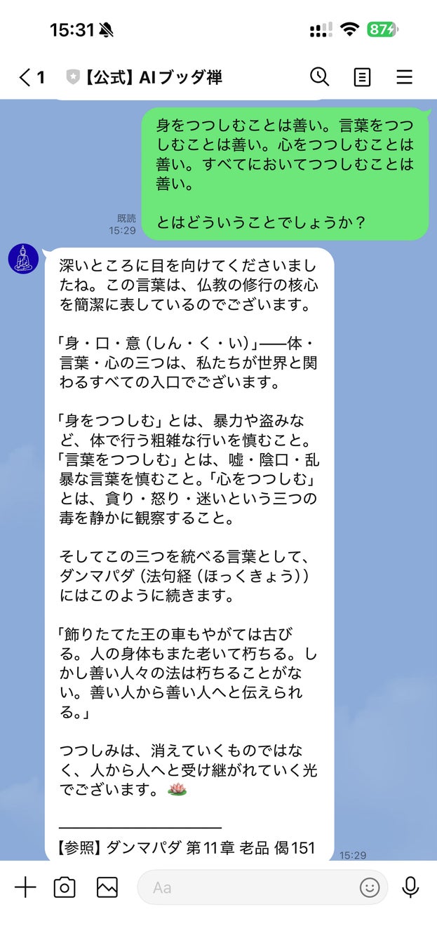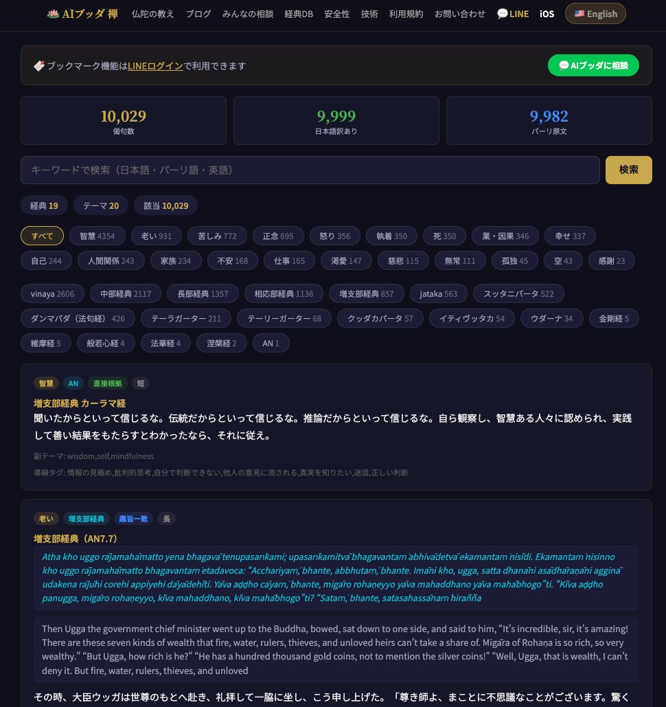 AIブッダ 禅は、パーリ仏典・大乗経典19種から10,000偈句以上をデータベース化したRAGシステムにより、すべての応答に経典名・章・偈番号を明記する仏教AI対話サービスです。