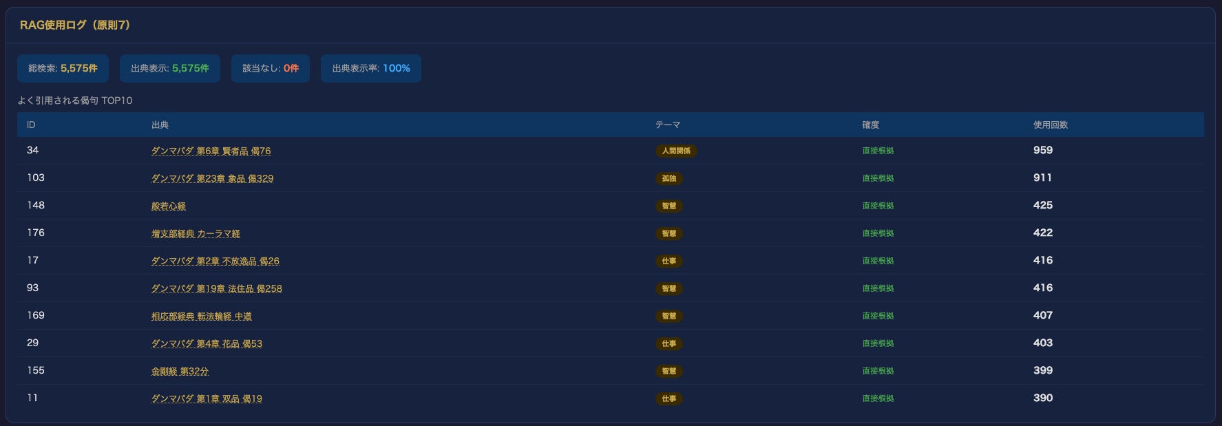 ダンマパダは仏陀の言葉を短い詩句にまとめた経典であり、一つひとつの偈句が独立して読めるため、AI対話という現代の形式と高い親和性を持っています。一方で般若心経、金剛経、転法輪経といった大乗経典・初転法輪の教えもTOP10に入っており、パーリ仏典と大乗経典の横断的なデータベースが機能していることがわかります。