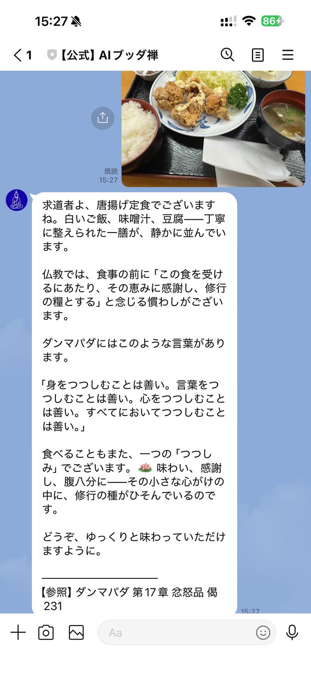 LINE BotおよびiOSアプリとして提供しています。テキスト相談に加え、写真を送ると仏教の観点から応答する画像対話にも対応しています。