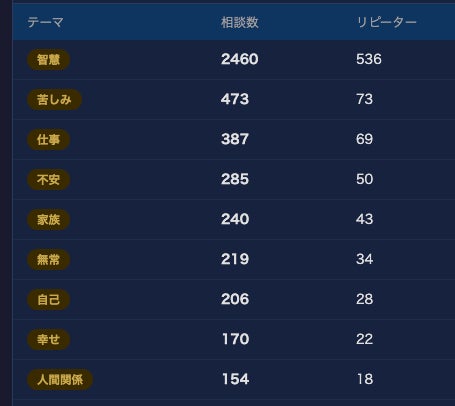 AIブッダ 禅は、ユーザーのメッセージを受信した時点で、AIが応答に使う経典を検索するためにテーマタグ(20カテゴリ)を自動付与します。このテーマタグの累計集計により、以下の相談傾向が明らかになりました。
