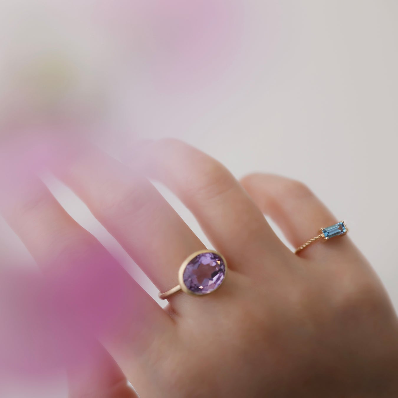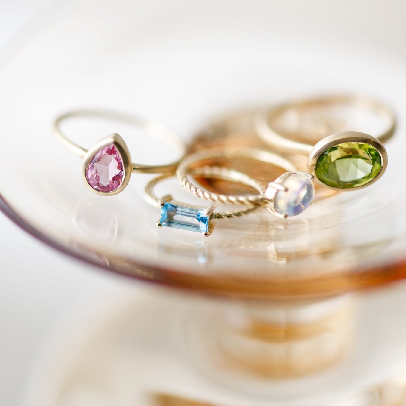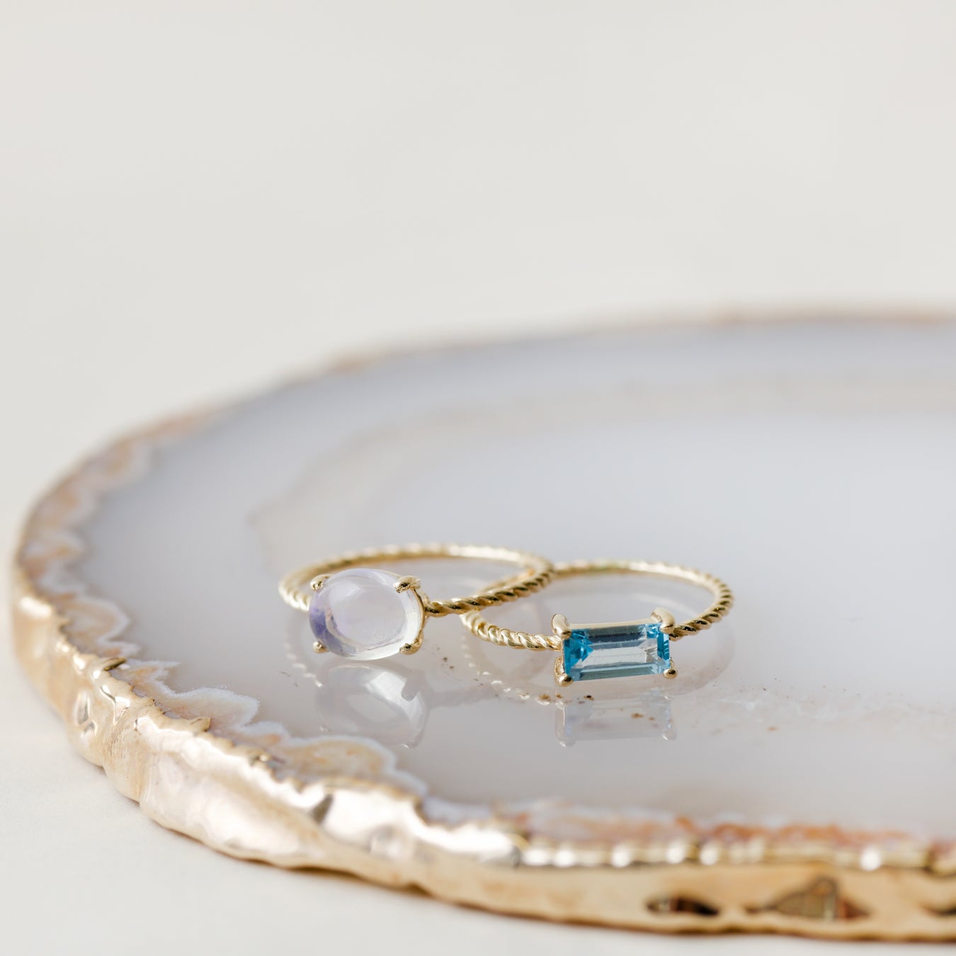 ツイストされた遊び心のある地金のデザインでしっかりとアクセントを作りつつも、 控えめな大きさの天然石が上品な印象へと導いてくれるアイテムです。ピンキーリングは、天然石が控えめなサイズから今まで天然石リングをあまり身に付けなかったお客様にも手に取りやすく、お持ちのジュエリーとの重ね付けを楽しんでいただけます。