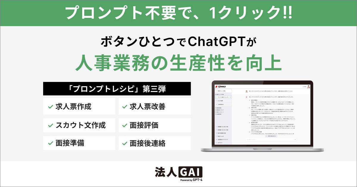 ボタンひとつで、ChatGPTが人事業務を効率化。ギブリー、法人GAIに人事職向けのプロンプトレシピ24種を追加。