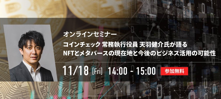 本セミナーでは、ゲストにコインチェック株式会社 常務執行役員であり、日本暗号資産ビジネス協会 NFT部会長の天羽健介氏をお招きし、NFTやメタバースのビジネスにおける活用例、今後の展望をご説明いただきます。みなさまのビジネスにぜひお役立てください。