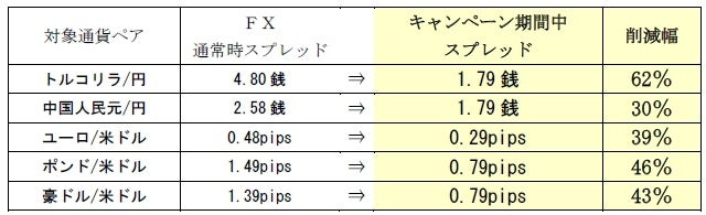 現在、米ドル/円については1万通貨までの注文のスプレッドを0.27銭、100万通貨までのスプレッドを0.29銭と業界最狭水準にてご提供しておりますが、今回、かねてよりお客さまよりご要望の多かった「トルコリラ/円」をはじめとした5通貨ペアにおいて、最大62%ダウンとなるスプレッド縮小キャンペーンを実施することとなりました。